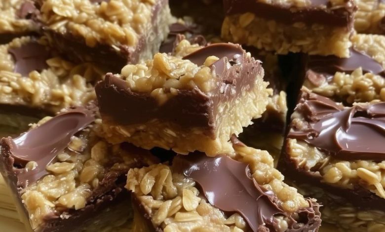 These No Bake Chocolate Oat Bars are a simple, delicious treat featuring a buttery brown sugar oat base that sandwiches a smooth layer of melted peanut butter and chocolate.