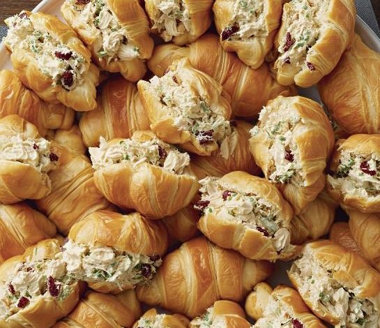 These elegant, bite-sized sandwiches are filled with a classic chicken salad made with celery, green onions, and Dijon mustard, all nestled inside flaky croissants.
