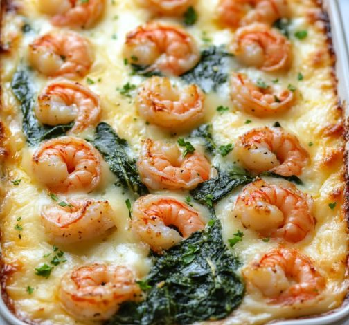This creamy, cheesy gratin is a luxurious yet simple dish that brings together succulent shrimp, fresh spinach, and rich Gruyère and Parmesan cheeses. Perfect for a cozy dinner or an elegant appetizer, it’s baked to golden perfection and finished with a touch of fresh parsley for brightness.