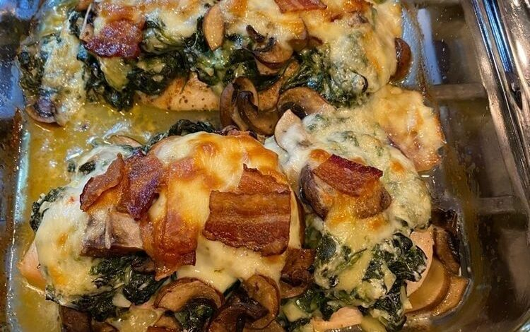 “Chicken in Creamy Spinach with Bacon and Mushrooms”