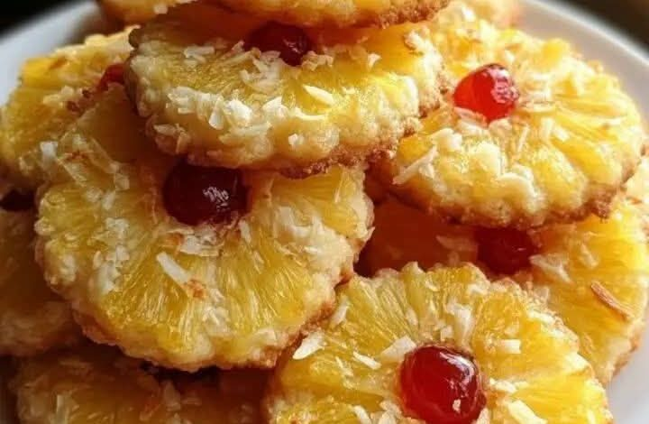 Scoop about 2 tablespoons of dough onto the prepared baking sheets, leaving about 2 inches between each. Gently press a dried pineapple ring onto each cookie, flattening slightly. Cut the rings if needed to fit.