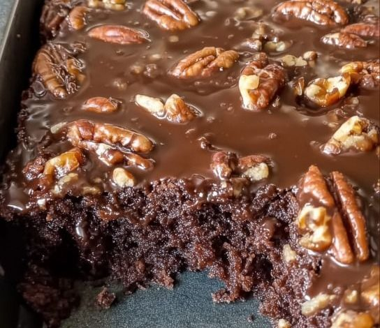 Spread the warm frosting over the cake while it’s still hot, then top with chopped pecans. Let sit until the frosting sets.