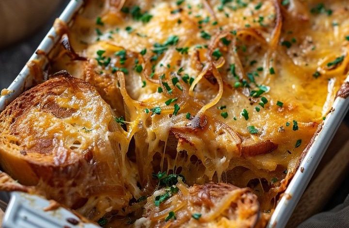 This French Onion Soup Casserole takes the deeply savory, cheesy, and comforting flavors of the classic French soup and transforms them into a hearty, easy-to-serve baked casserole. It features layers of caramelized onions, rich broth, toasted bread, and a blanket of melted Gruyère and Parmesan cheese.