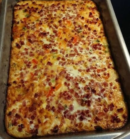 - Add Ingredients: Layer cheese, cubed ham, and green onion evenly over the hash browns.