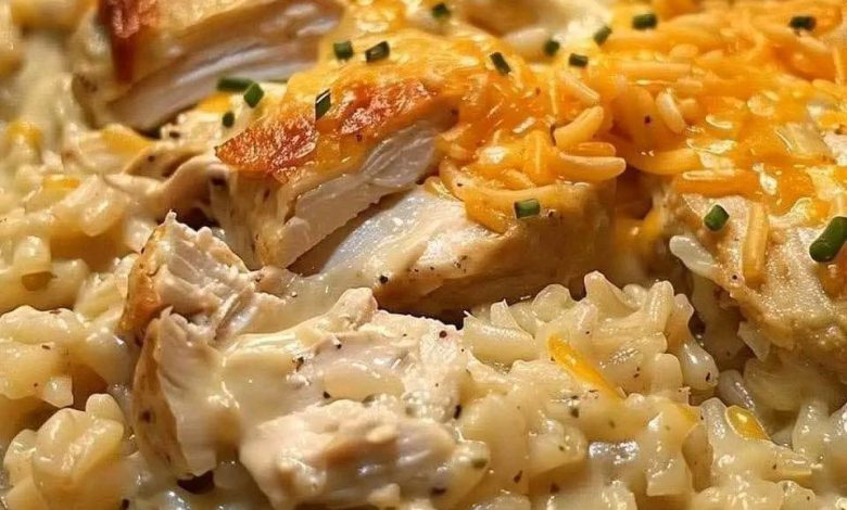 This cozy casserole brings together uncooked rice and bite-size chicken pieces in a rich, creamy blend of chicken broth and cream of celery soup. It bakes up tender and flavorful, then finishes with a layer of melted cheddar cheese on top.