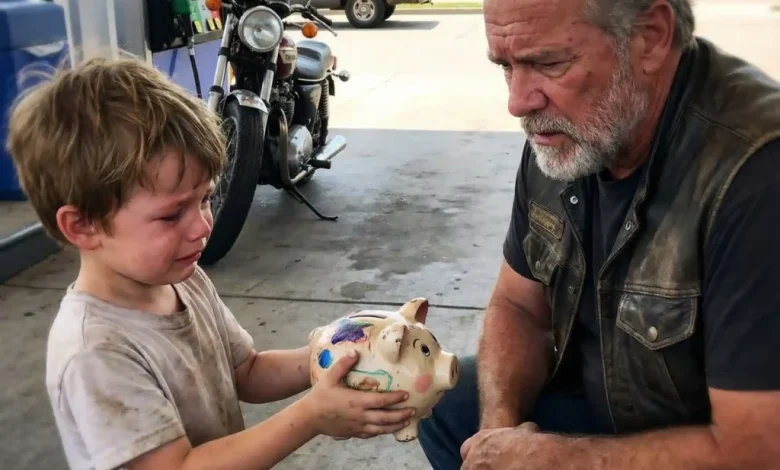 He couldn’t have been more than five, clutching a ceramic pig scribbled with crayon, tears streaking his face. I had just finished fueling my Harley when tiny fingers tugged at my vest.