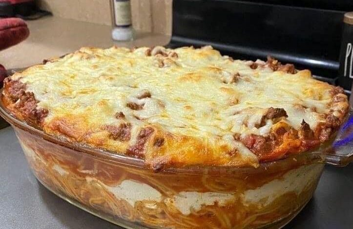 - Step 4: Assemble the Casserole: Spread half of the prepared spaghetti noodles in the bottom of a 9×13-inch baking dish. Carefully spread the creamy cheese mixture over the top of the noodles. Place the remaining noodles in a second layer over the cheese mixture. Pour the meat and sauce mixture evenly over the top layer of noodles.
