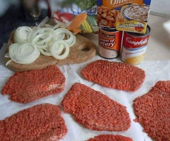 - Layer ingredients: In your slow cooker, layer the cube steaks, onion slices, cream of chicken soup, cream of celery soup, Lipton Onion Soup Mix, and water.