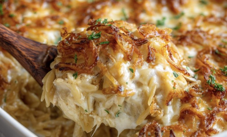 This recipe combines the sophistication of French flavors with the ease of a casserole. Orzo pasta is the quiet hero here — absorbing every bit of goodness from the golden onions, garlic-infused broth, and a splash of cream. The result is a bubbling, golden bake that tastes like it took hours, even though it comes together surprisingly fast.