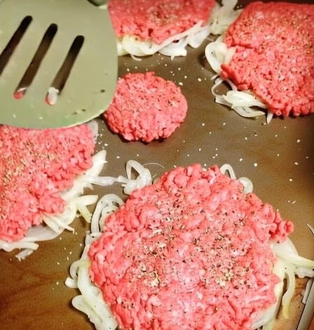 - Press a patty directly onto the onions, flattening firmly with a spatula.