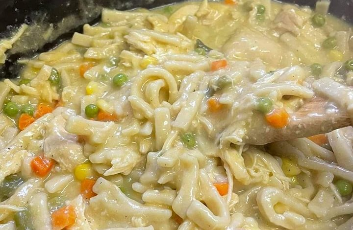 This simple Chicken Noodle Meal is made in a slow cooker, resulting in a creamy, flavorful broth with tender shredded chicken and hearty frozen noodles.