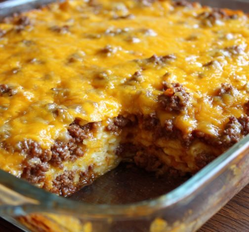 - Base Layer: Spread a thin layer of meat sauce in a 9×13-inch baking dish.