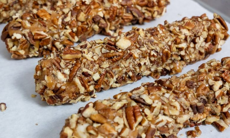 Spread the chopped pecans in a shallow dish. Dip each frozen log into the melted caramel, coating completely, then roll in the pecans, pressing gently so they stick.