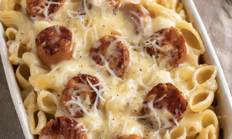 This flavorful and hearty Polish Pasta Casserole combines smoked kielbasa and tangy sauerkraut with creamy penne pasta, all baked under a rich, cheesy Swiss sauce.